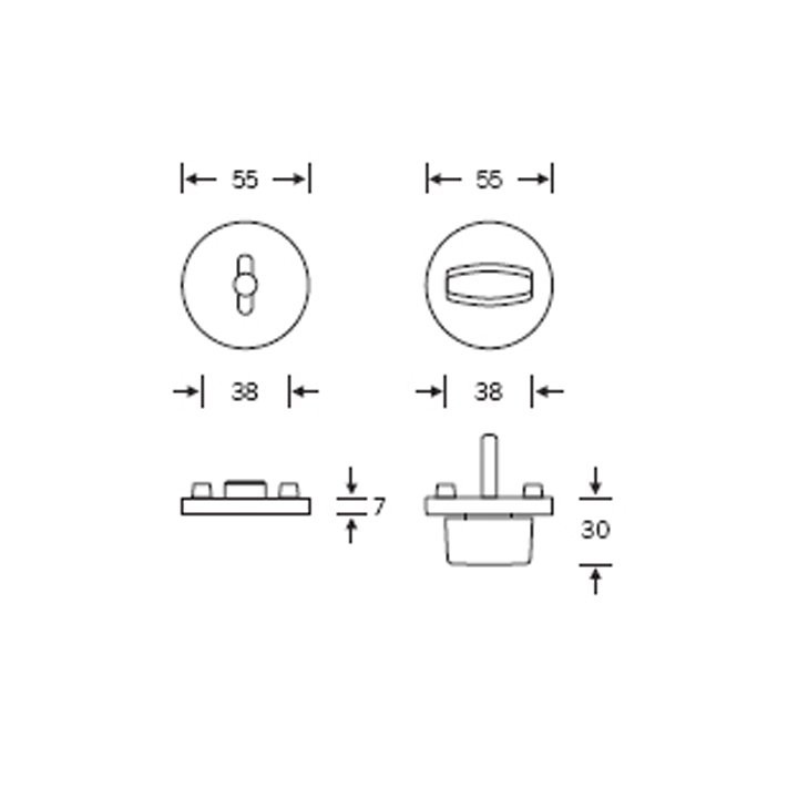 In Edelstahl matt oder Aluminium F1 erhältlich, eignet sich die Rosette für Türstärken von 37–41 mm. Ein hochwertiges Detail für Bad- und WC-Bereiche.