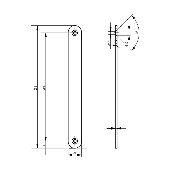 Modell 9000 0351 Material Edelstahl Form gerade, abgerundet Maße 24 x 235 mm Materialstärke 3 mm Richtung DIN links/rechts verwendbar