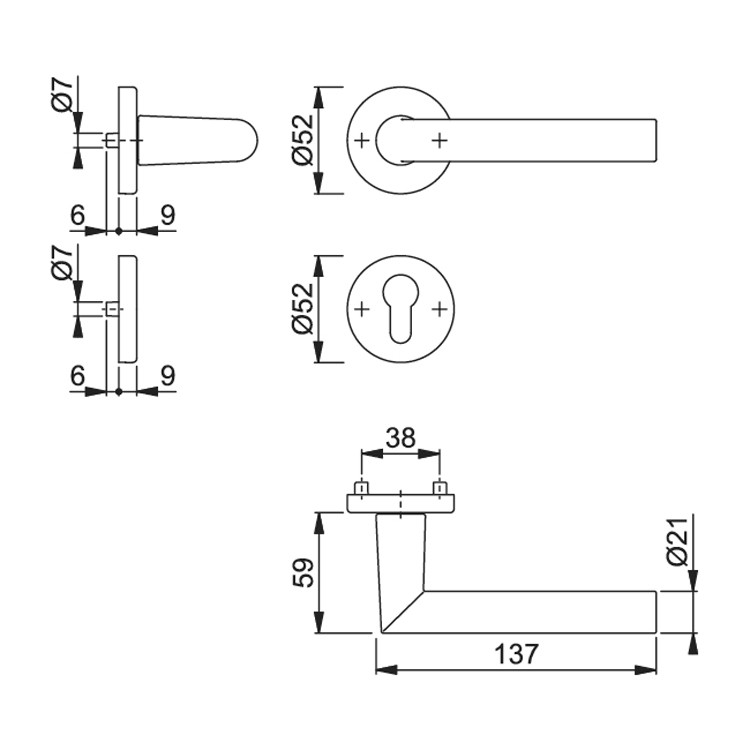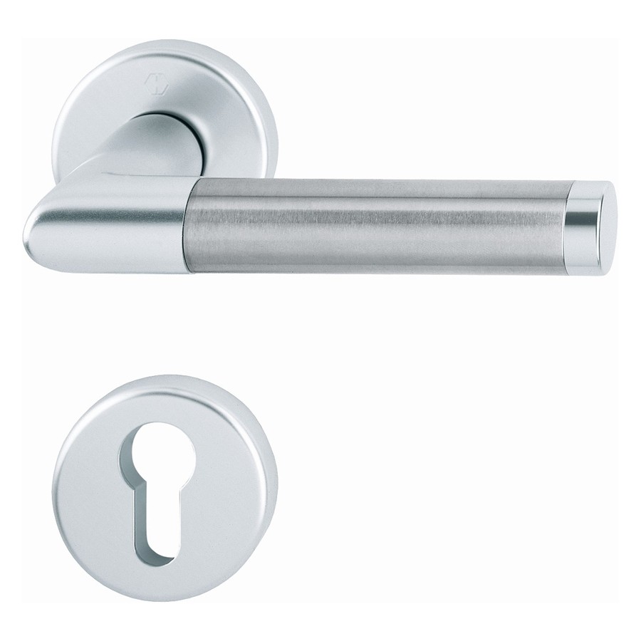Ausführung HOPPE-Schnellstift-Verbindung Verschraubung verdeckt, durchgehend, mit Gewindeschrauben Rosetten mit Kunststoff-Unterkonstruktion und Stütznocken, Rückholfeder Material Aluminium und Edelstahl - Zubehör