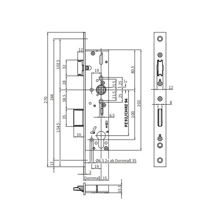 Das Panikschloss für einflügelige Türen mit Panikfunktion auf dem Innendrücker. Nach einer Fluchttürfunktion von innen ist der Außendrücker wieder eingekuppelt. Durchgang von außen nach innen möglich.Modell B-18240 Panikfunktion Durchgangsfunktion D Entfernung 92 mm Flügelanzahl einflügelig Stulp Flachstulp, beidseitig überstehend, Edelstahl matt Stulpmaße 270 x 24 x 3 mm Drückernuss Spezialnuss, Stahl Nuss Innenvierkant 9 mm Schlosskasten Offen, Stahl, Oberfläche verzinkt Schlosskastenmaße 202 x 52 x 15,5 mm Falle Standardfalle, Stahl Fallenausschluss 12 mm Schlossriegel 2 tourig Riegelausschluss 20 mm Feuer-Rauchschutz FH - für feuerhemmende Türen Türart Paniktür, Rohrrahmentür, Feuerschutztür, Rauchschutztür Türausprägung Türe stumpf Öffnungsrichtung Anschlag Links/Rechts (umlegbare Falle) Zugelassen nach EN 12209 für Feuerschutztüren,