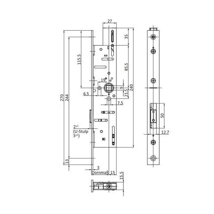 Modell B-18910 Produkttyp Panik-Treibriegelschloss Funktion Panikfunktion Flügelanzahl Zweiflügelig Türart Fluchtwegtür, Rohrrahmentür Türwerkstoff Aluminium, Stahl Öffnungsrichtung Anschlag Links-Rechts Dornmaß 35 mm Stulp 270 x 24 x 3 mm, kantig, beidseitig überstehend Nuss 9 mm, Spezialnuss Ausfräsung Mit Riegelausschnitt Schlosskasten Vorgerichtet für Treibriegelstange Maße Schlosskasten (Länge x Breite x Stärke) 240 x 47 x 15,5 mm Türausprägung Türe stumpf Einzelteilmaterial Schlosskasten Stahl Einzelteilmaterial Drückernuss Stahl Einzelteilmaterial Stulp Edelstahl Oberfläche Falle Verzinkt Oberfläche Riegel Verzinkt Oberfläche Schlosskasten Verzinkt Prüfzeugnisse/Normen DIN EN 179