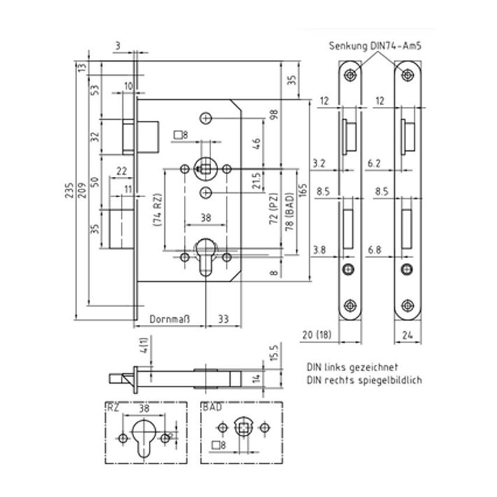 Klasse 3 (DIN 18 251) Lochung PZW Entfernung 72 mm Dornmaß 65 mm Nuss 8 mm Feder-Klemmnuss, Sintermetall Stulp 20 x 235 x 3 mm, rund, Niro Schlosskasten Geschlossen, verzinkt, mit Zuhaltungssicherung Falle Zinkdruckguss vernickelt Riegel Zinkdruckguss vernickelt Richtung links/rechts auswählbar Schließblech nicht enthalten Das dazu passende BMH Nr. 300 Einsteckschloss mit WC-Lochung finden Sie hier!