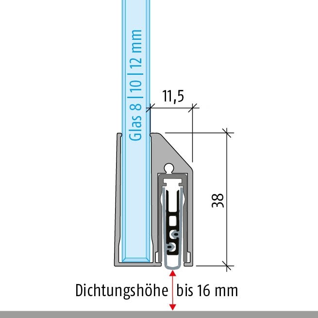 Dichtungshöhe bis 16 mm Schalldämmwert 48 dB Türstärke 10 mm Auslösung Einseitig & geräuschlos Dichtmaterial Silikon Auch erhältlich für Glastüren mit einer Stärke von 8 mm oder 12 mm!