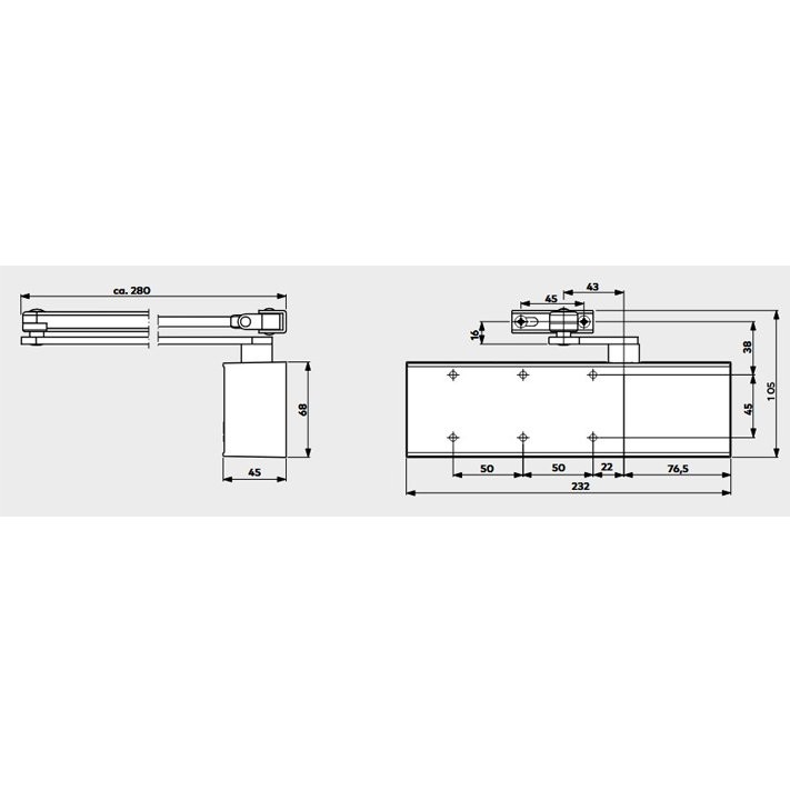 Maximale Türbreite 1100 mm Schließkraft einstellbar über Gestängeschanier (EN3/4) Schließgeschwindigkeit stufenlos einstellbar 180°-15° / 15°-0° Schließverzögerung nein Endschlag stufenlos einstellbar (über Gestänge) Öffnungsdämpfung einstellbar Abmessung 232x45x68mm Feststellung optional - Zubehör