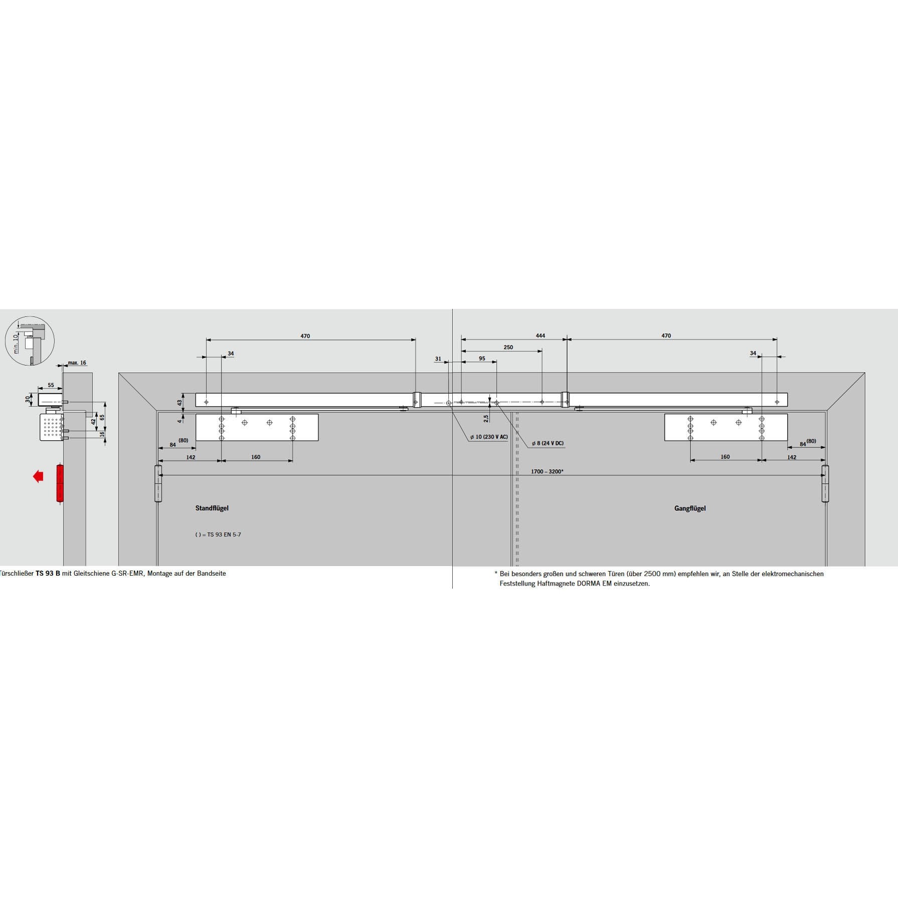 für Türbreiten 1700 - 2500 mm Feststellung Beide Flügel Anschlussspannung 230 V AC +- 10 % max. Nennausgangsleistung 9,8 W Lieferumfang - 2 Stück Türschließer TS 93 B inkl. Montageplatte