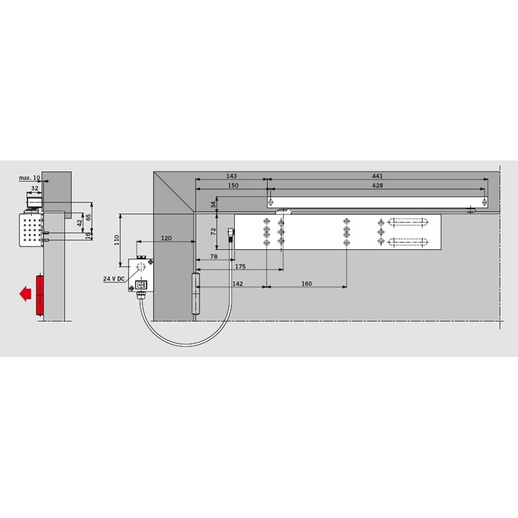 Maximale Türbreite 1250 mm Schließkraft stufenlos einstellbar Schließgeschwindigkeit stufenlos einstellbar Schließverzögerung nein Endschlag stufenlos einstellbar Abmessung 413x52x71 mm Feststellung inklusive Eingangsspannung 24 V DC Leistungsaufnahme 2 Watt - Zubehör