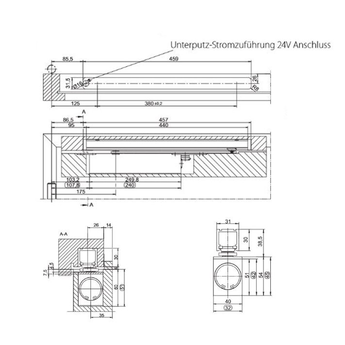 Die Gleitschiene überzeugt durch ihre kompakte Bauweise (Länge 440 mm, Höhe 30 mm, Breite 31 mm) und ihre zuverlässige Technik. Sie ist rechts wie links verwendbar und eignet sich für einflügelige Türen. Durch die integrierte Montage bleibt die Technik dezent und unauffällig im Türdesign.