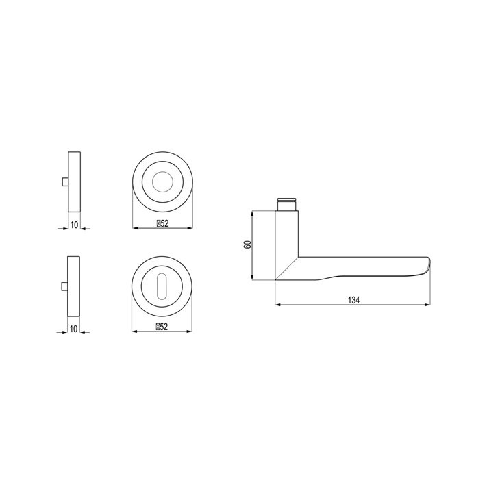 Konstruktion 3-teilige Rosette, rund Material Edelstahl Gebrauchskategorie Klasse 3 Vierkantmaß Exzentrisch gebohrt 8x8 mm Griffmaß 134 x 60 mm ∅ 20 mm Rosettenmaß ∅ 52mm Lochung Wahlweise BB, PZ oder WC DIN 1906 Dauerhaftigkeit Klasse 7 DIN 1906 -Korrosionsbeständigkeit Klasse 3