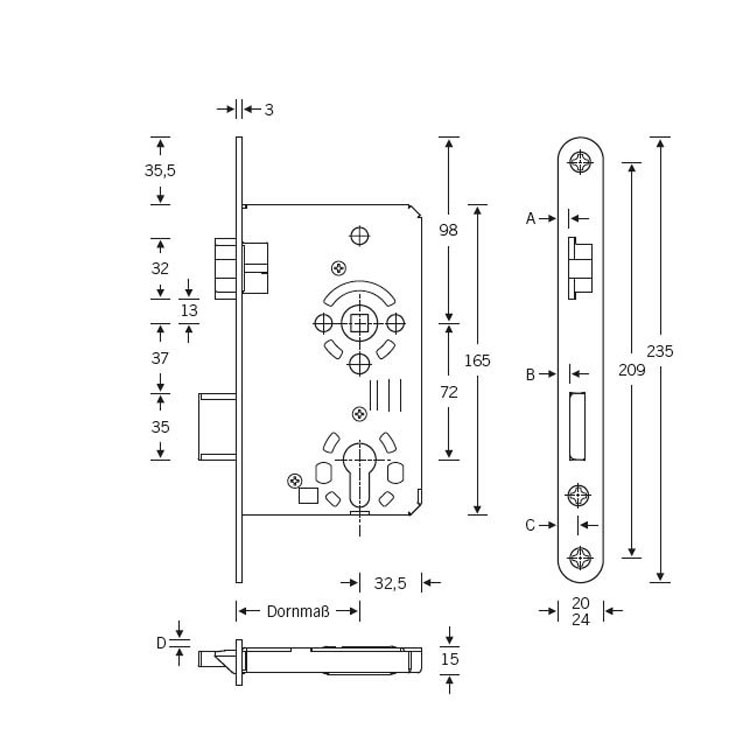 SSF FH 19 Einsteckschloss Brandschutztür Dornmaß 65 mm DIN rechts