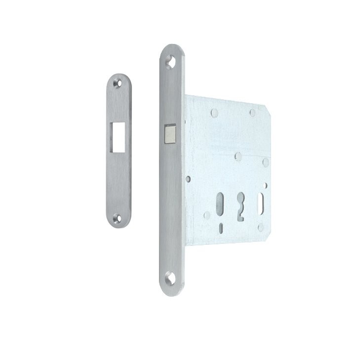 Serie 71 Ausführung Einsteck-Schiebetürschloss mit Zirkelriegel Zirkelriegel Vernickelt Lochung BB Dornmaß 55 mm Stulp 20 x 150 mm rund, Edelstahl Richtung DIN Links/Rechts verwendbar Zubehör Schließblech 4240 00/500 (103x20x2 mm, rund, Niro)