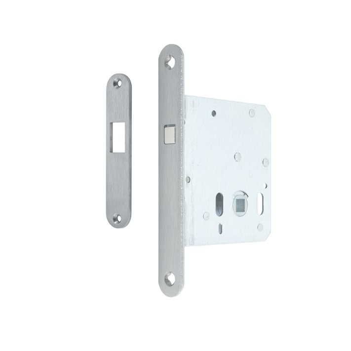 Serie 71 Ausführung Einsteck-Schiebetürschloss mit Zirkelriegel Zirkelriegel Vernickelt Lochung WC Dornmaß 55 mm Stulp 20 x 150 mm rund, Edelstahl Richtung DIN Links/Rechts verwendbar Zubehör Schließblech 4240 00/500 (103x20x2 mm, rund, Niro)